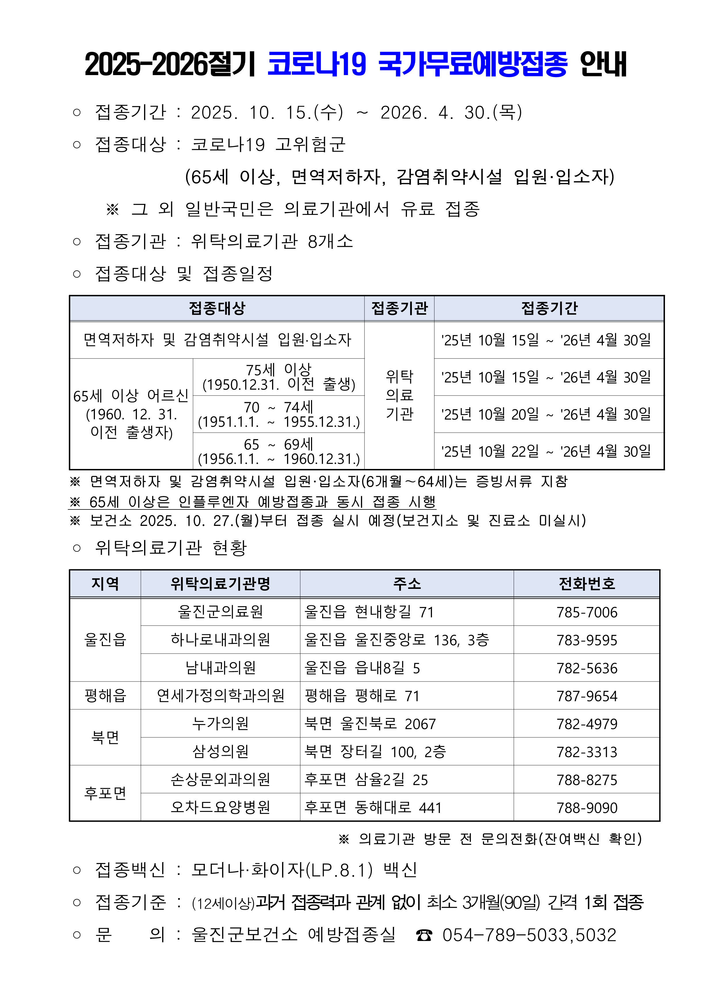 2025-2026절기 코로나19 국가무료예방접종 안내