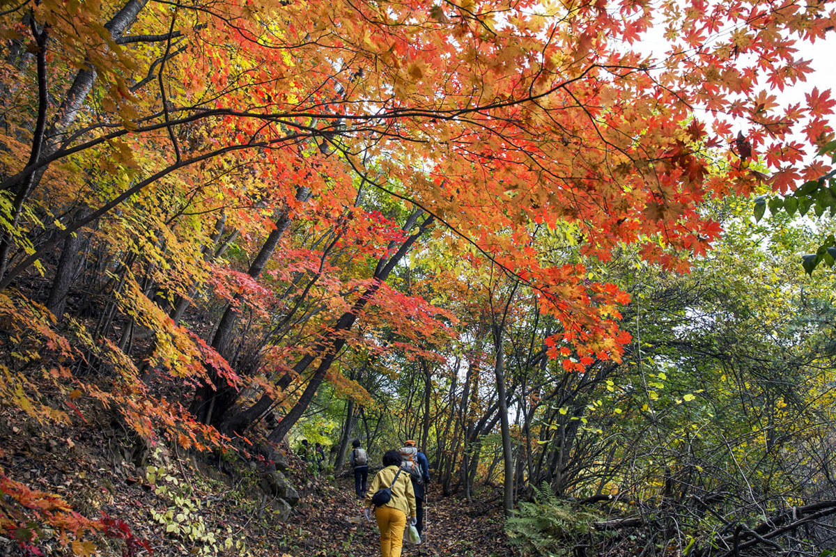 사시사철 푸른 금강송숲에 울긋불긋 가을옷으로 갈아입은 나무들이 화려하게 길을 밝혀 더욱 아름답다.