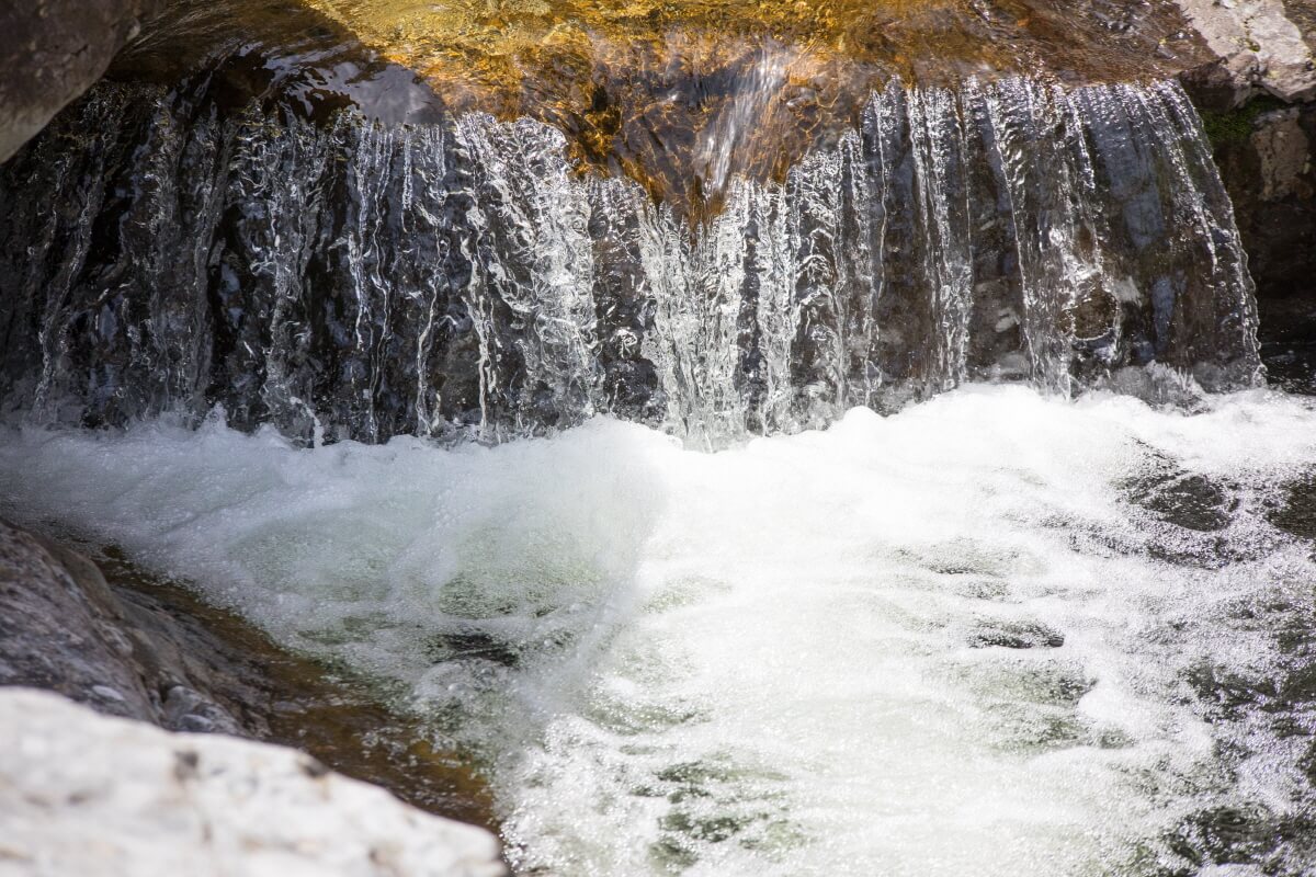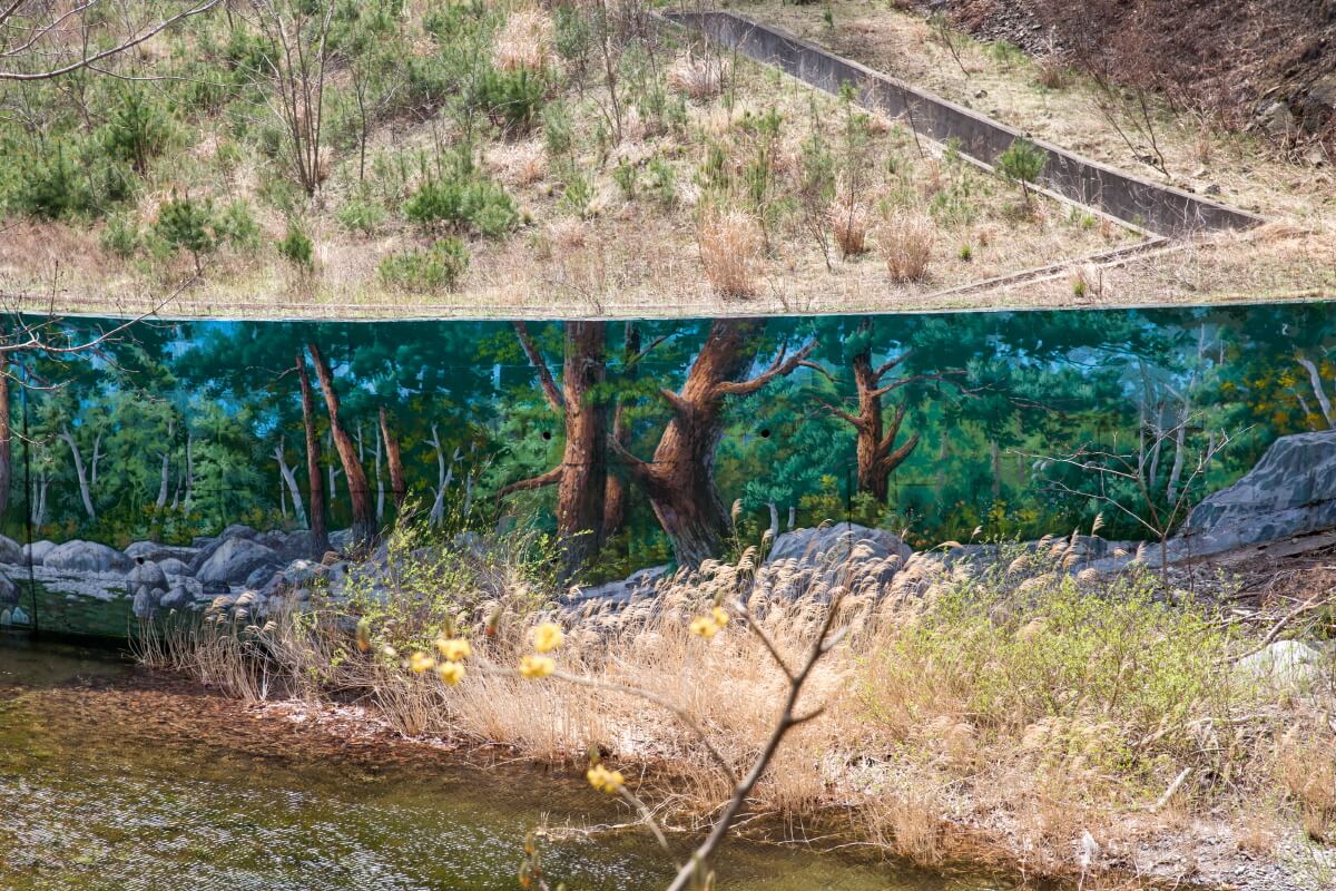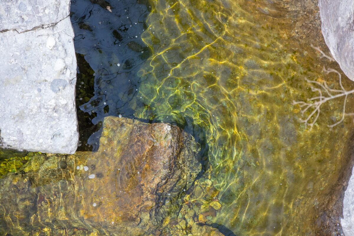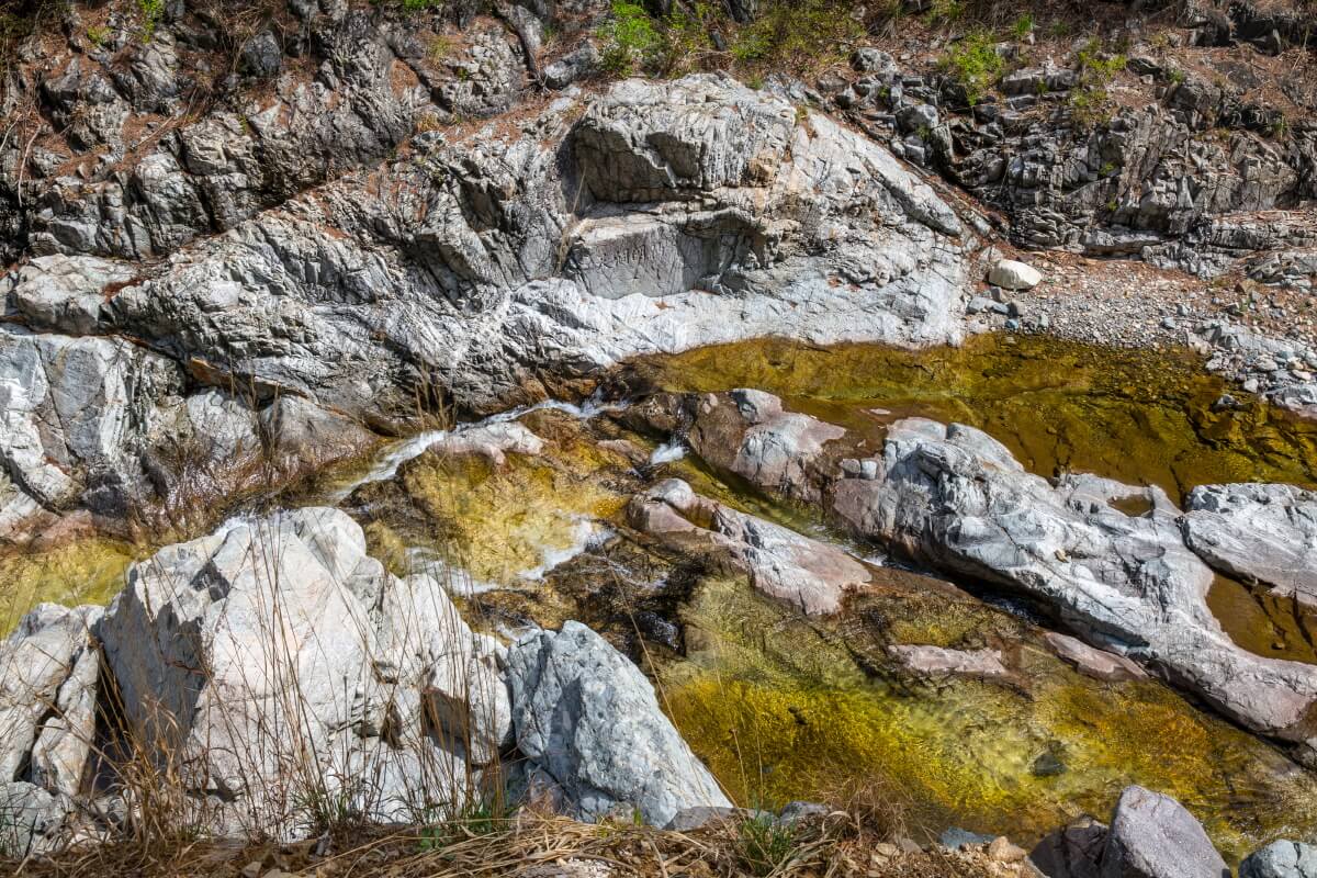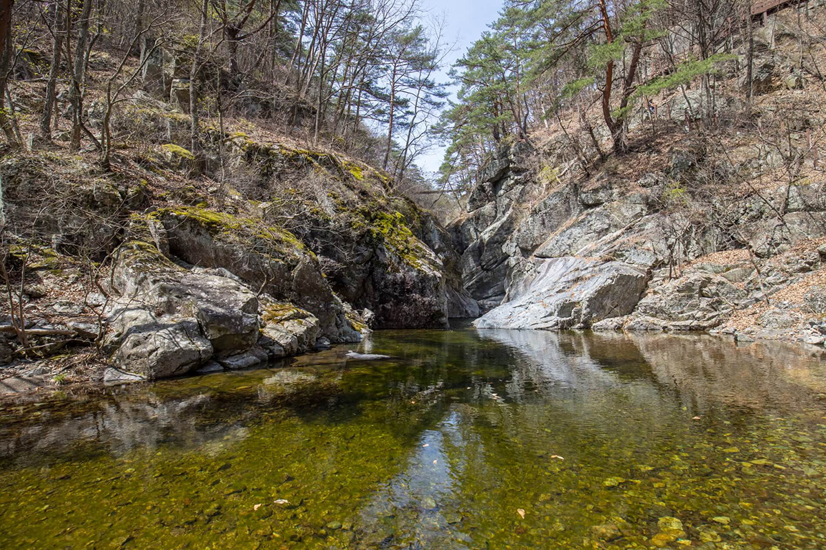 나무데크를 통해 내려와 가까이 접할 수 있다. 깎인 바위틈으로 흘러 깊게 고인 검푸른 물이 가진 신비한 아름다움이 느껴진다.